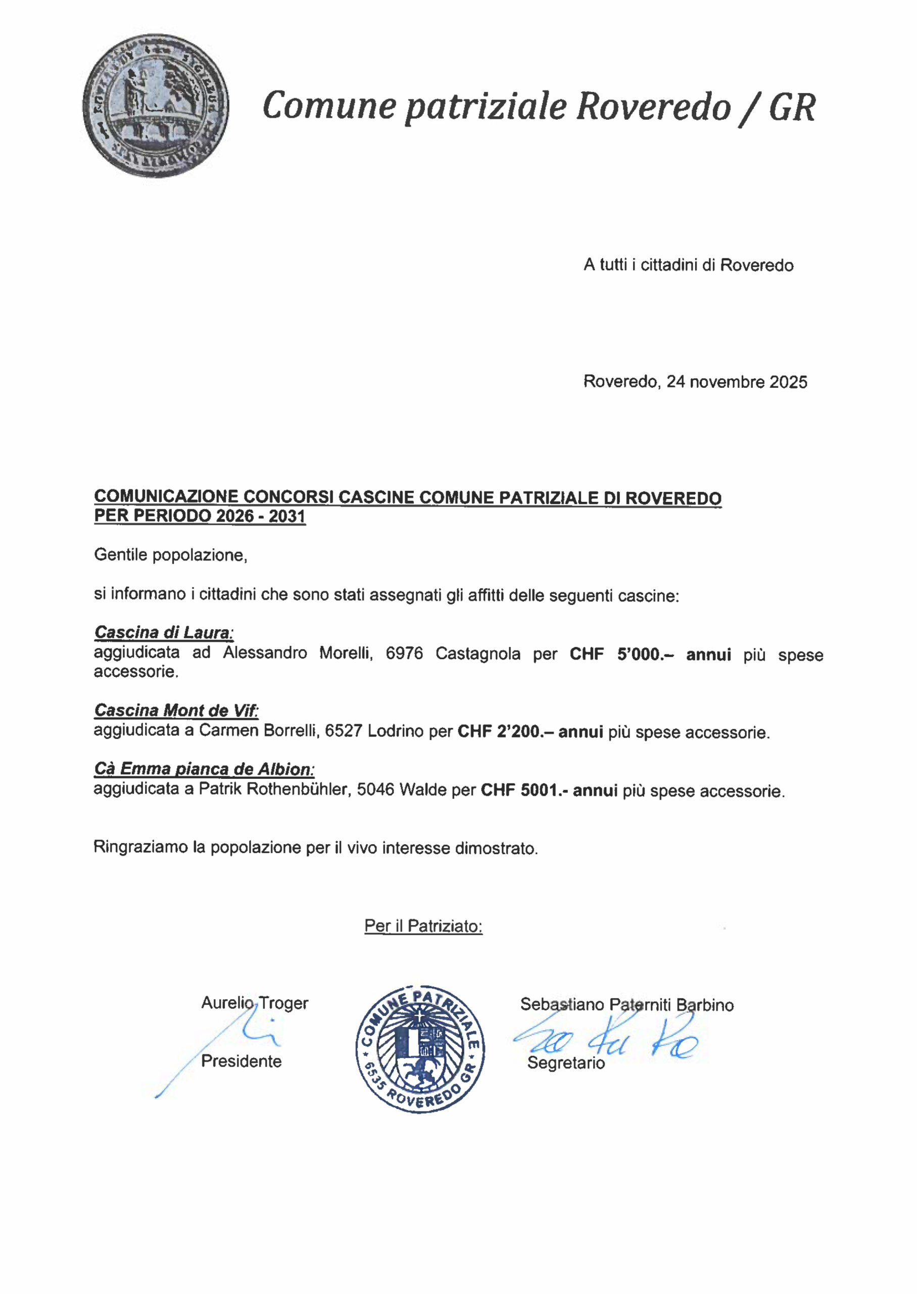 Durante il periodo della Repubblica Elvetica (1798-1803) si cominciò con quello che dura tuttora, ossia l’accentramento dei poteri (a Coira e a Berna), accompagnato da un’esponenziale crescita della burocrazia. Nel 1802 il Prefetto del distretto della Moesa, Giovanni Antonio a Marca, su ordine della Prefettura centrale, incarico tutte le autorità dei comuni del Moesano di procedere a un censimento della popolazione. Ricevuti tutti i dati, il 18 maggio 1802 egli stese la Tabella della popolazione del Distretto Moesa nel Cantone della Rezia. Roveredo contava una popolazione di 442 Patrizi su 749 abitanti.