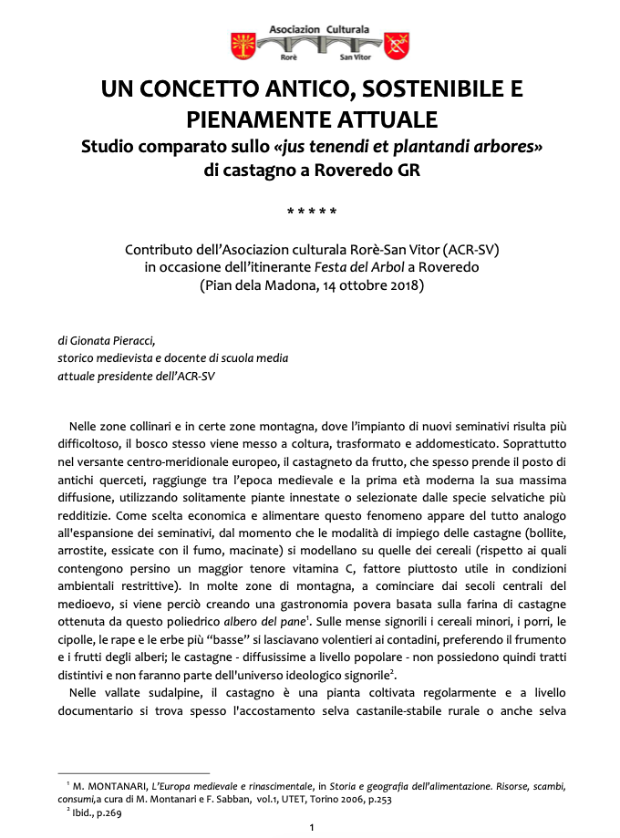 Studio comparato sullo «jus tenendi et plantandi arbores» di castagno a Roveredo GR. Contributo dell’Asociazion culturala Rorè-San Vitor in occasione dell’itinerante Festa del Arbol a Roveredo. Pian dela Madona, 14 ottobre 2018. (Scarica il PDF)